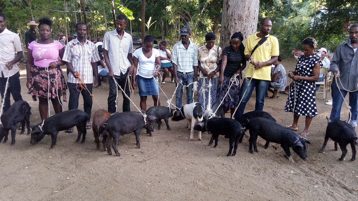 Con la recaudación de 4.965 € se llevó a cabo el proyecto de la compra de 53 cerdos en la comuna de Léogâne, localizada en el departamento oeste de Haití. Los campesinos de esta comunidad se han beneficiado con la entrega de un cerdo por familia. Antes de hacer las distribuciones, se procedió a vacunar cada cerdo, de manera que nos aseguremos que los cerdos estén en buena salud. Cada beneficiario deberá continuar a hacer lo mismo según la indicación del veterinario.